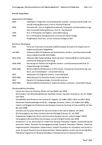Greta Olson ist Leiterin des MeDiMi-Teilprojekts „Dehumanizing, Victimizing, or Universalizing? How Images of Migration Interact with Human Rights Discourse“, das die affektive Wirkkraft von Bildern der Migration im Kontext von Menschenrechten untersucht. Greta ist Professorin für Englische und Amerikanische Literatur- und Kulturwissenschaft und Direktorin des Center for Diversity, Media, and Law (DiML) an der Justus-Liebig-Universität Gießen. Sie war Fellow am Käte Hamburger Kolleg „Recht als Kultur“ der Universität Bonn (2014, 2016) und sie ist zusammen mit Jeanne Gaakeer Gründerin des European Network for Law and Literature. Ihre interdisziplinären Forschungsinteressen umfassen unter anderem die Bereiche Law and Literature, Cultural-Legal Studies, Affect Theory, Narratology, Feminist and Sexuality Studies, Cultural Studies und Visual Politics. Greta ist in den USA aufgewachsen und lebt seit über 30 Jahren in Deutschland mit Stationen in Freiburg, Innsbruck, Bonn und Gießen. Sie lehrt zu kulturellen, politischen und literarischen Entwicklungen in den Vereinigten Staaten.