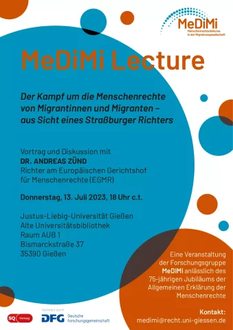 Die Forschungsgruppe „Menschenrechtsdiskurse in der Migrationsgesellschaft“ (MeDiMi) lädt zur ersten MeDiMi Lecture anlässlich des 75-jährigen Jubiläums der Allgemeinen Erklärung der Menschenrechte ein. Die Forschungsgruppe freut sich, den Schweizer Richter am Europäischen Gerichtshof für Menschenrechte Dr. Andreas Zünd zu Vortrag und Diskussion begrüßen zu dürfen. Dr. Zünd spricht zum Thema „Der Kampf um die Menschenrechte von Migrantinnen und Migranten – aus Sicht eines Straßburger Richters“.