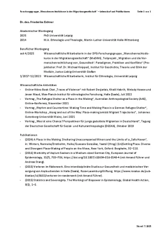Friederike Eichner ist wissenschaftliche Mitarbeiterin (Postdoc) im MeDiMi-Teilprojekt „Migration und die Vermenschenrechtlichung von ‚Gesundheit‘: Paradigmen, Praktiken und Konflikte“. Sie arbeitet zu den Themen Migration, Gesundheit und Affekte aus sozialanthropologischer Perspektive und hat an der Universität Leipzig promoviert. Ihr PhD „Affective Gaps. Shelter Life, Social Work and Sentiment in a German Refugee Shelter“ spürt den politischen Spannungen der globalen Migration empirisch nach und nutzt dafür affektive Dynamiken in einer Geflüchtetenunterkunft als Hinweise. Die Arbeit bietet einen neuen Ansatz, akuten psychischen und emotionalen Stress unter jungen Geflüchteten jenseits von Trauma zu betrachten. Davor hat sie in einem interdisziplinären Projekt zur Gesundheitsversorgung Asylsuchender an der Schnittstelle Anthropologie und Medizin gearbeitet.