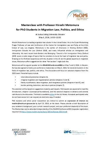 Motomura will be a guest speaker at the #MeDiMiConference2026 on May 7 and 8, 2026, in Giessen. He has also agreed to hold a pre-conference masterclass on May 6, 2026, for doctoral students in the fields of migration law, politics, and ethics. The discussions will focus on selected chapters from the 2025 book. Potential topics include