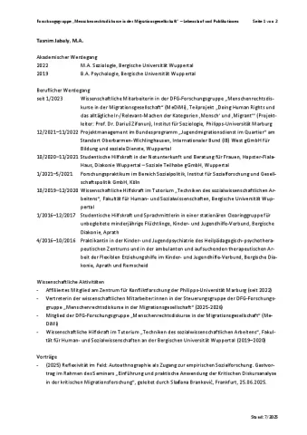 Tasnim Jabaly, M.A., ist wissenschaftliche Mitarbeiterin und Doktorandin am Institut für Soziologie der Philipps-Universität Marburg sowie affiliiertes Mitglied des Zentrums für Konfliktforschung. Im Teilprojekt „Doing Human Rights und das alltägliche Ir-/Relevant-Machen der Kategorien ‚Mensch‘ und ‚Migrant‘“ der DFG-Forschungsgruppe MeDiMi untersucht sie, wie Zugehörigkeit im Alltag ausgehandelt wird und welche Rolle Menschenrechte dabei spielen. Im Rahmen ihrer Dissertation führte sie über ein Jahr lang ethnografische Feldforschung durch, die sie aktuell fortsetzt. Sie studierte Psychologie (B.A.) und Soziologie (M.A.) an der Bergischen Universität Wuppertal. Forschungspraktische Erfahrungen sammelte sie unter anderem am Institut für Sozialforschung und Gesellschaftspolitik in Köln. Zudem war sie in verschiedenen Praxisfeldern tätig, darunter in der Jugend- und Sozialarbeit sowie beruflich in der stadtteilbezogenen Projektarbeit. Ihre Forschungsinteressen umfassen Wissenssoziologie, Ethnografie, Konfliktforschung und die Soziologie der Menschenrechte. Seit 2025 ist sie als Vertreterin der wissenschaftlichen Mitarbeiter:innen in der Steuerungsgruppe der Forschungsgruppe MeDiMi aktiv.