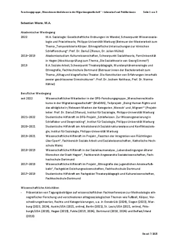 Sebastian Weste ist wissenschaftlicher Mitarbeiter und Doktorand am Institut für Soziologie und Mitglied am Zentrum für Konfliktforschung der Phillips-Universität Marburg. Er forscht im MeDiMi-Teilprojekt „Doing Human Rights und das alltägliche Ir-/Relevant-Machen der Kategorien ‚Mensch‘ und ‚Migrant‘“. Sebastian Weste studierte an der Fachhochschule Dortmund Soziale Arbeit mit einem Fokus auf Theaterpädagogik, Mundanphänomenologie und Ethnografie im Bachelor. Parallel absolvierte er an der FernUniversität in Hagen ein Akademiestudium in den Kulturwissenschaften mit dem Schwerpunkt auf Sozialtheorien. Anschließend studierte er an der Philipps-Universität in Marburg Soziologie im Master mit den Schwerpunkten Wissenssoziologie und Praxistheorien. Seine Masterarbeit verfasste er zum Thema „Temporalisierte Körper. Ethnografische Untersuchungen zur klinischen Schlafforschung“. Während seines Studiums war er als studentische und wissenschaftliche Hilfskraft an diversen Forschungsprojekten beteiligt. Dabei forschte und publizierte er vor allem zur Disruption und Stabilisierung alltagsweltlicher Orientierungsmuster. Seine Forschungsinteressen liegen in den Bereichen Alltagssoziologie, Raumsoziologie, Ethnomethodologie und Humandifferenzierungsforschung.