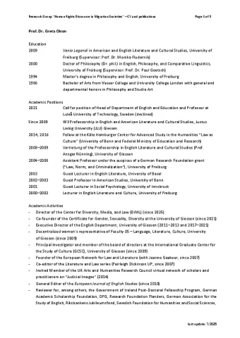 Greta Olson is Principal Investigator of the MeDiMi project “Dehumanizing, Victimizing, or Universalizing? How Images of Migration Interact with Human Rights Discourse”, which examines affective responses to images of migration in the context of human rights. Greta is a Professor of English and American Literature and Cultural Studies and is Director of the Center for Diversity, Media, and Law (DiML) at Justus Liebig University of Giessen. She was a Fellow at the Käte Hamburger Center for Advanced Study in the Humanities “Law as Culture” at the University of Bonn (2014, 2016). With Jeanne Gaakeer, she is the founder of the European Network for Law and Literature. Her interdisciplinary research interests include Law and Literature, cultural-legal studies, affect theory, narratology, feminist and sexuality studies, cultural studies, and visual politics. Greta grew up in the United States and moved to Germany in 1986. After academic stopovers in Freiburg, Innsbruck, Basel, and Bonn, she began teaching literary, cultural, media, legal and sexuality studies at the University of Giessen in 2008.