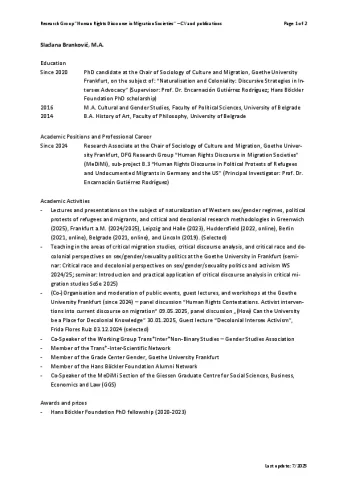 Slađana Branković is a PhD candidate and teaching assistant at the Chair of Sociology of Culture and Migration, Goethe University Frankfurt, and Research Associate in the MeDiMi project “Human Rights Discourse in Political Protests of Refugees and Undocumented Migrants in Germany and the US”. Branković holds an MA in Cultural and Gender Studies from the University of Belgrade, Serbia. Their research centers on issues of naturalization of Western sex/gender regimes, marginalization of migrants and BIPoC within trans and intersex movements and communities, political protests of refugees and migrants, and discursive strategies of resistance within different socio-political movements. Branković acts as a co-speaker of T*I*N- Studies Working Group in the Gender Studies Association and co-speaker of the MeDiMi Section of the Giessen Graduate Centre for Social Sciences, Business, Economics and Law (GGS). Through their work in the T*I*N-Studies WG and different activist collectives, they engage with the subject of marginalization and exploitation of trans and intersex people and migrants in social movements and research. Their research interests lie in the areas of trans, intersex, and queer studies, decolonial theory, critical race studies, critical migration studies, discourse analysis, and politics of representation.