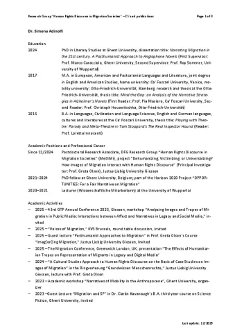 Simona Adinolfi is a postdoctoral Research Associate in the MeDiMi sub-project “Dehumanizing, Victimizing, or Universalizing? How Images of Migration Interact with Human Rights Discourse”. She completed her PhD in Literary Studies with a thesis titled “Narrating Migration in the 21st Century. A Posthumanist Approach to Anglophone Novels” at Ghent University, in Belgium. During her PhD, she took part in the Horizon 2020 project “OPPORTUNITIES: For a Fair Narrative on Migration”, in which she analyzed migration narratives in the Italian public media landscape. Her research interests include narrative theory, critical posthumanism, migration studies, and digital media studies. She has published on On_Culture, Diegesis, and Cahier voor Literatuurwetenschap (CLW).