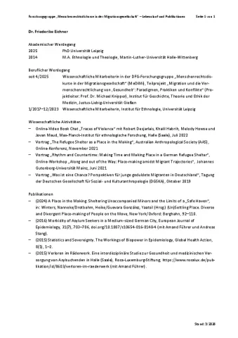 Friederike Eichner is a postdoctoral Research Associate in the MeDiMi project “Migration and the Humanrightization of ‘Health’: Paradigms, Practices, and Conflicts”. She works on topics related to migration, health, and affects from a social anthropological perspective and earned her PhD at Leipzig University. The thesis “Affective Gaps. Shelter Life, Social Work and Sentiment in a German Refugee Shelter” explores the political tensions of global migration, using affective dynamics in the shelter as a lens. Her work offers a new approach to understanding acute emotional and psychological stress among young refugees, going beyond the concept of trauma. Prior to that, she worked on the intersection of anthropology and medicine in an interdisciplinary research project on healthcare for asylum seekers.