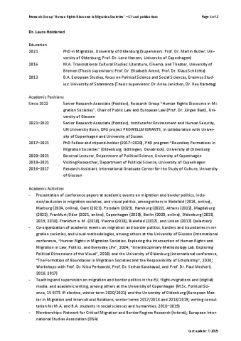 Laura Holderied is a postdoctoral researcher in MeDiMi’s coordination unit in which she contributes to synthesizing the research of the group and to the overall project’s theory building. Hereby, she is particularly interested in the politics and politicization of human rights and the production of inclusions/exclusions in migration societies. Prior to that, Laura was a Senior Research Associate at the UN University’s Institute for Environment and Human Security in Bonn as well as a guest researcher and external lecturer at the Department of Political Science at the University of Copenhagen teaching in the field of EU migration and border politics. Laura completed her PhD as a stipend-holder in the PhD program “Boundary Formations in Migration Societies” at University of Oldenburg in 2021 with a dissertation on the role of images in the context of migration and border politics. Laura’s research interests lie at the intersections of (critical) migration and border studies, visual politics, and visual and interpretative international relations. She is particularly interested in social and political conflicts about mobility, rights, and inclusion/exclusion in migration societies and the role of images, visual discourses, and in/visibilities in these struggles. In her research, Laura combines visual methodologies with discourse analysis, digital ethnography, and narrative interviews. Laura’s research has been published in International Political Sociology, Cooperation and Conflict, and a Leviathan special issue on Democracy and Migration, among others. Her book “Visual Border Politics. Images and Migration Governance in Europe” is forthcoming at Routledge (Interventions Series).