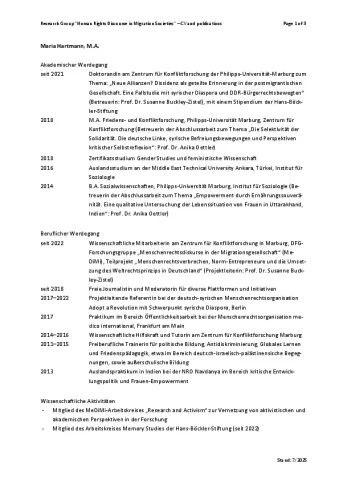 Maria Hartmann is a Research Associate and PhD fellow in the MeDiMi project “Human Rights Crimes, Norm Entrepreneurs, and the Implementation of the Principle of Universal Jurisdiction in Germany”. Maria has studied sociology and conflict studies at the University of Marburg and in Turkey. Starting in 2017, she worked for several years in Berlin as a project manager for the human rights organization Adopt a Revolution on the Syrian conflict. In 2021, she returned to the Center for Conflict Studies for her dissertation, which deals with the experience of dissidence as a potential for solidarity in the post-migration society. As a stipend-holder of the Hans Böckler Foundation, she is a member of several working groups on memory, diaspora, and critical migration studies. She works as a freelance journalist and moderator for various platforms, as an editor for the journal Wissenschaft+Frieden, as well as politically on the subject of feminism and transnational solidarity with a regional focus on West Asia. Her main research interests are diaspora and critical migration studies, memory in the post-migration society, German foreign policy in West Asia, as well as participatory research and feminist methods.